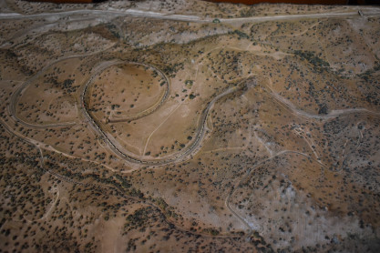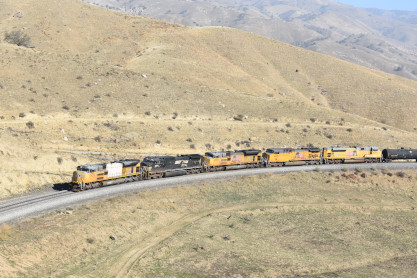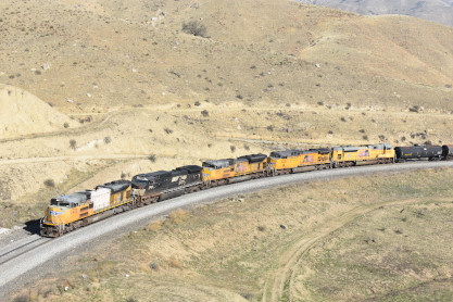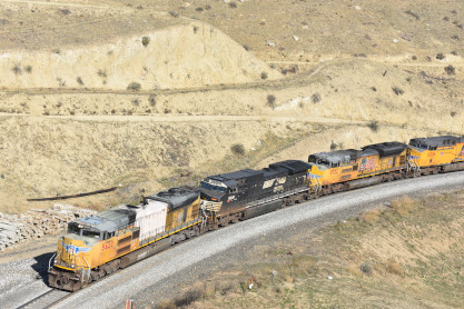 An aerial photograph of a Union Pacific train rounding the Tehachapi Loop.