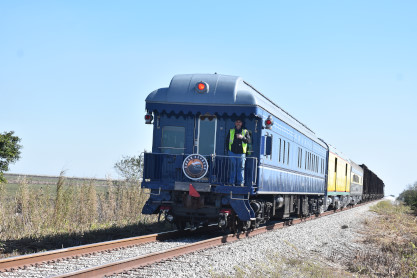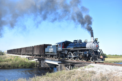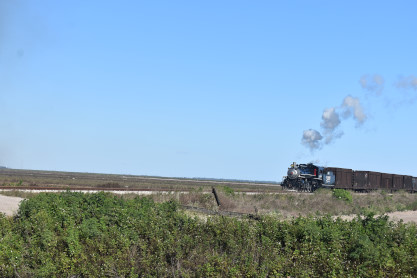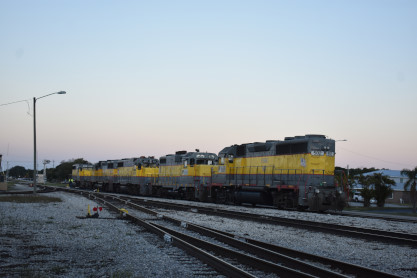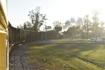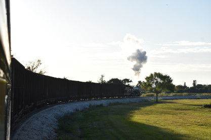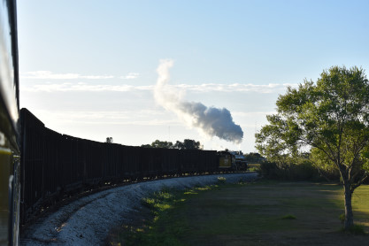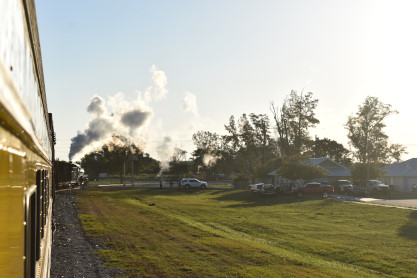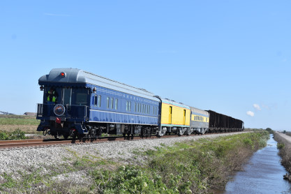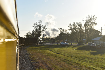 U.S. Sugar engines lined up for their work. We then boarded through the Georgia 300 and took one side of table in the Palmdale Car with a gentleman. The train departed the U.S. Sugar yard and soon I was in the vestibule for that big curve as we departed Clewiston.