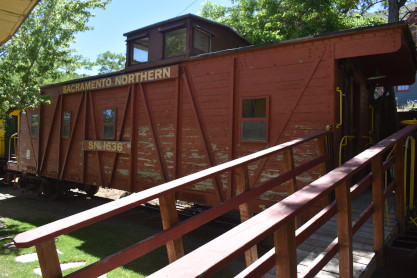Sacramento Northern caboose 1636 built by Pullman in 1906 as Western Pacific outside-braced wooden box car 15672. It was converted to caboose 637 in 1942 and became Sacramento Northern 1636 in 1958, then was on display in Sacramento then trucked to Virginia City where it was restored.