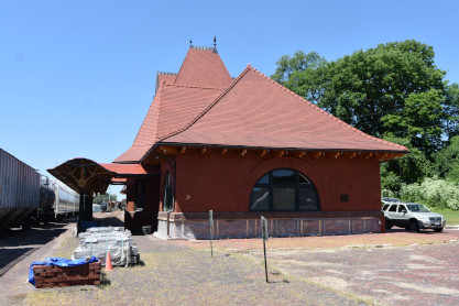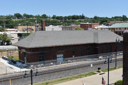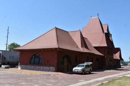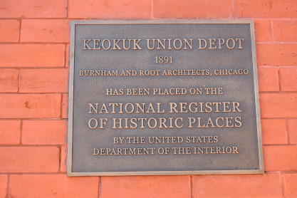 Keokuk Union Depot, erected in 1891, was designed by the Chicago architectural firm Burnham and Root, noted for its railroad depot designs across the Midwest. Five railroads served Keokuk, a bustling business and transportation center at the confluence of the Mississippi and Des Moines Rivers and site of a series of locks that allowed river traffic to bypass the rapids upriver from the city. The new depot, combining passenger and express traffic of all railroads, was constructed and operated by the Keokuk Union Depot Company, jointly owned by the railroads.