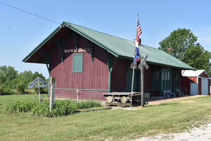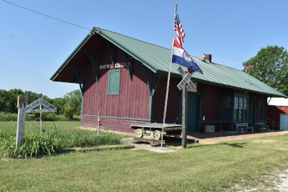 Keokuk & Western Downing station built in 1872. This railroad was originally chartered in Missouri as the Alexandria and Bloomfield Railroad Company, by Special Act of February 9, 1857, which called for the building of a railroad from Alexandria, Missouri in the direction of Bloomfield, Iowa to the northern boundary of the state of Missouri. A subsequent Act on February 19, 1866, changed the corporate name to the Alexandria and Nebraska City Railroad Company. It later became part of the Chicago, Burlington and Quincy Railroad.