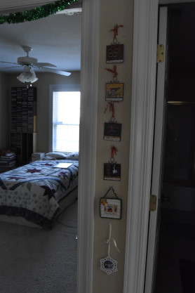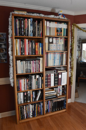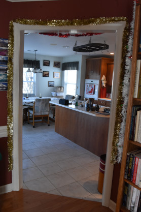 We have placed garland above most doors and around some bookcases; this is Elizabeth's musical theatre book collection.
