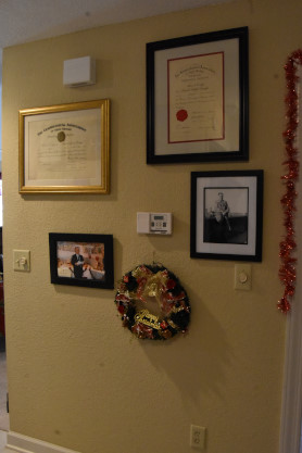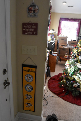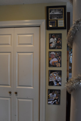 The wall nect to the front door and the Pittsburgh Penguins emblem through the years.