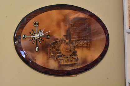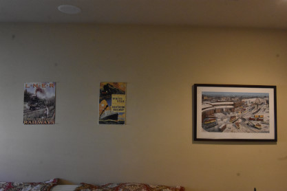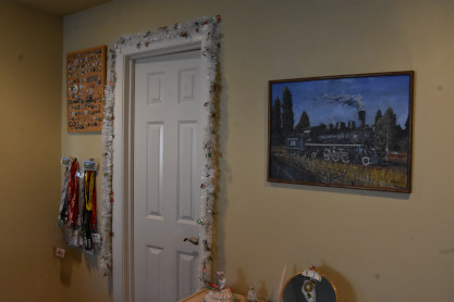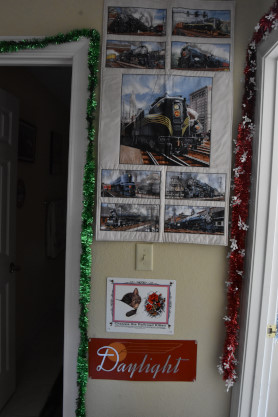 In the master bedroom is a Jeffrey Hartmann oil painting of the McCloud River Railroad at Hambone that he painted for Chris to commemorate his first trip aboard that railroad. Also pictured are our lanyards from various photo charters, conventions and conferences.