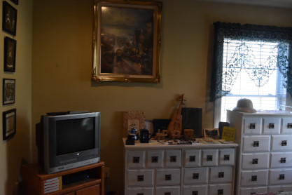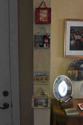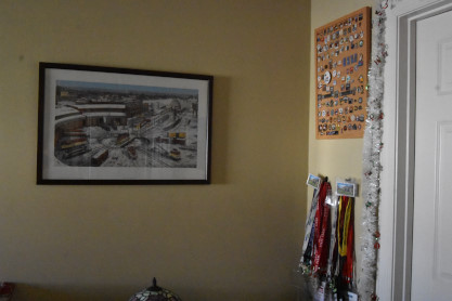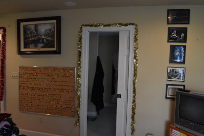 Garland around the master bathroom door, Chris' rock and roll pictures and the last Thomas Kinkade painting, "Sunset on Lamplight Lane". Below is the corkboard containing municipal lapel pins of British Columbia and Alberta.