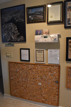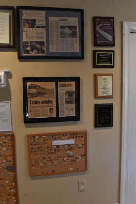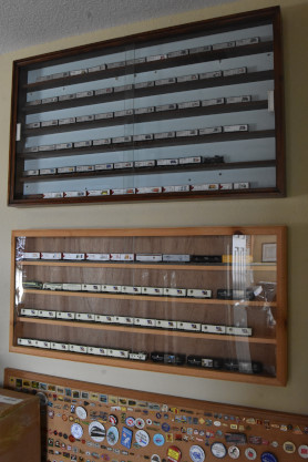 Chris' awards for his Millionth Mile overall and on Amtrak, NRHS twenty-five year award, the Victoria, British Columbia Canadian Pacific Railway roundhouse aerial photograph and Elizabeth Street, New York. The pin boards contain Quebec municipal pins; there are over one thousand local governments in that Canadian province.