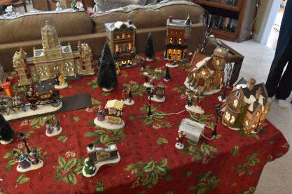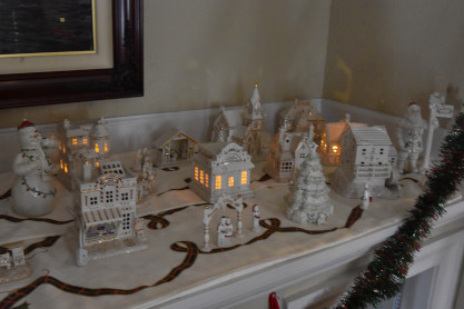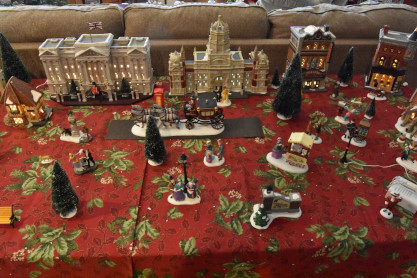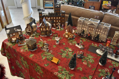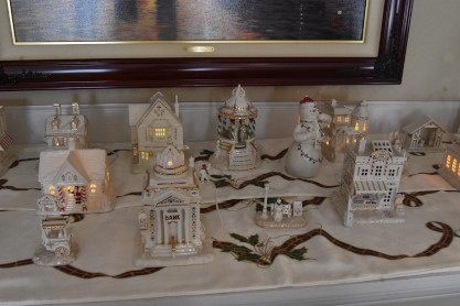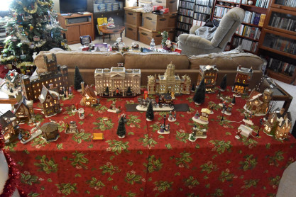 Close-ups of the Department 56 buildings, including the Victoria and Albert Museum, Buckingham Palace and Downton Abbey.