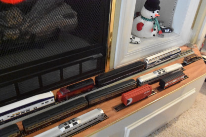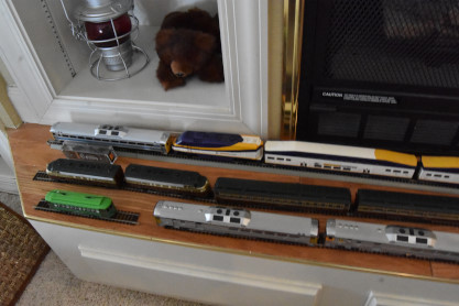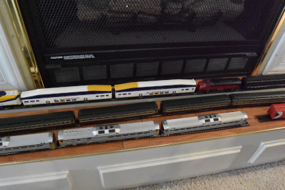 HO model trains on the hearth, a mixture of Canadian Pacific, Canadian National, Pacific Great Eastern and British Columbia Railway RDCs, Westcoast Express, Napa Valley Wine Train, the "Roald Amundsen" Presidential Car and others.