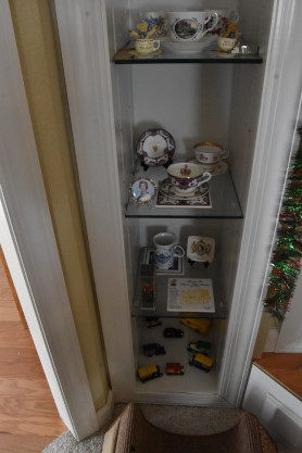 A variety of china cups and saucers, including the commemorative china produced by the Fairmont Empress Hotel in Victoria for the Queen's Golden Jubilee in 2002.