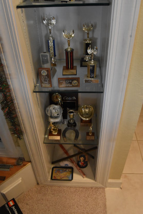 Trophies that Chris won over the years as a child and when he was an athletic coach, as well as Elizabeth's dancing trophies from her twelve years at Sinclair Academy of Dancing in Victoria.