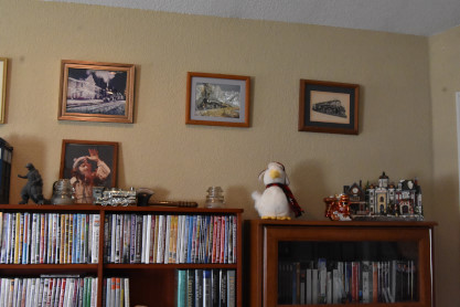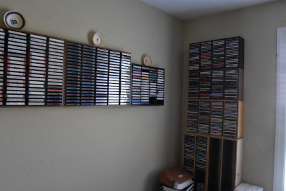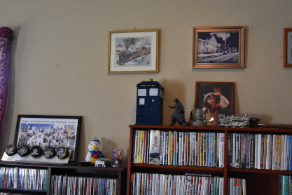 My retirement gift from Heninger Elementary School, a Doctor Who Tardis and my Nevada Northern station photograph above my compact disc collection.