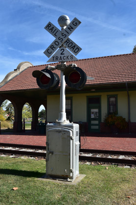 A crossing signal in the front of this station.