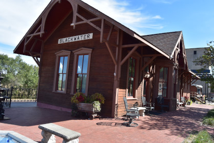Missouri Pacific Blackwater replica station built in 2008. The original depot was built in 1888 by the Missouri Pacific Railroad and was a busy and vital place in its early years. It was a ticket office for the railroad, a telegraph office and station to handle all mail and freight going through the area. The depot was torn down in 1973 and rebuilt in 2008, being used as an event space until present.