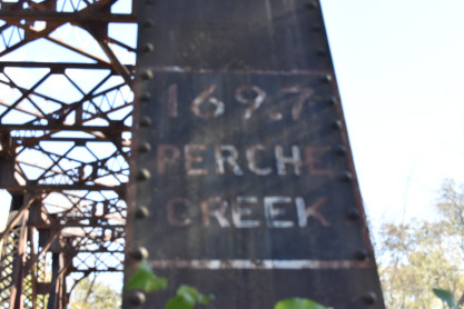 On the west side of the trestle is the sign milepost 169.7 Perche Creek.