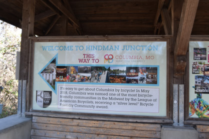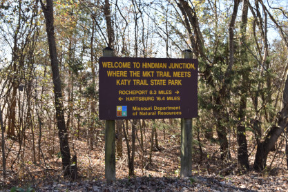 Welcome to Hindman Junction, where the MKT Trail meets Katy Trail State Park. Rochepost 8.3 miles west and Hartsburg 16.4 east.