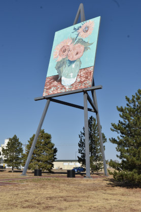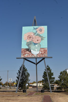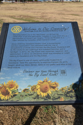 The Big Easel project, the brainchild of artist Cameron Cross in Goodland, Kansas, consists of one of the seven Sunflower Paintings, measuring 24 feet x 32 feet and rests on an 80 feet high, 45,000 pound steel easel, and sets the world record for being the World's Largest Easel, according to the World Record Academy.