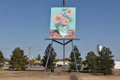 "There is no mystery behind Cameron Cross's Big Easel Project, and the public work is exactly as it sounds. In 2001, Cross began work on a 24-foot by 32-foot reproduction of Van Gogh's Three Sunflowers in a Vase, which he then displayed on a giant steel easel on the outskirts of Goodland, Kansas," the Atlas Obscura says. "Somewhere between roadside attraction and part of the landscape, the massive still life replication easily draws the gaze of drivers and visitors, but seldom sees much more attention than that. "Cross first dreamt up the idea in his hometown of Altona, Canada. After working as a teacher and artist in the town, he wanted to give something back, and so decided to recreate one of the Dutch master’s works. Well received locally, Cross travelled across the world to Australia and eventually Kansas where he erected his massive picture on an 80-foot easel off Interstate 70.