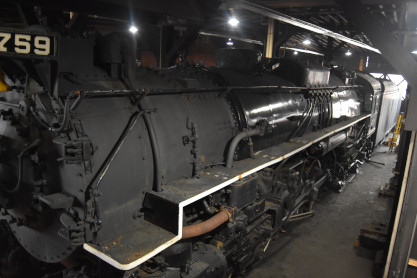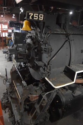 Nickel Plate Road 2-8-4 759 built by Lima in 1944. In May 1958, 759 was the last steam locomotive the NKP overhauled and it was retired soon after. F. Nelson Blount bought 759 in 1962 for his collection in Bellows Falls. Ross Rowland, Jr., then carried out repairs and on 17th August 1968, it made several trial runs. Two weeks later, it began an excursion career that lasted until 1973. Briefly fired up at Steamtown in 1977, work was to begin on reflueing, but sponsorship fell through and the locomotive has stood cold ever since.