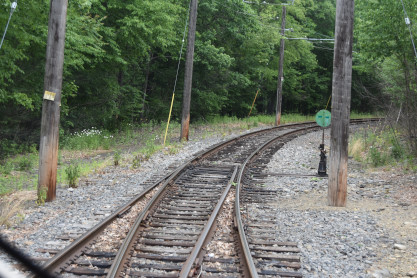 At 10:15, we walked over to where the train was boarding. After a young child yelled "All Aboard", we boarded the first car behind the engine, Central Railroad of New Jersey suburban coach 1026 built by American Car and Foundry in 1923. I took the window seat for our first steam train ride at Steamtown. The rules were that every one must be seated as the train moved. We started foward before we reversed toward the mainline.