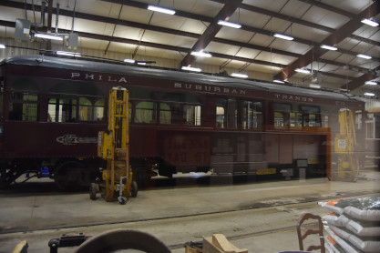 Philadelphia Suburban Transportation Company 76 built by J.G. Brill Company in 1926. This is a "Center Door" car originally built for the PSTC predecessor company, the Philadelphia and West Chester Traction Company. It was the highest-numbered car of a 32-car fleet of such cars bought in three orders, starting in 1919. These crowd-swallowing trolleys roamed the "Red Arrow Lines" system from 69th Street Terminal in Upper Darby to suburban terminals in West Chester, Ardmore, Media and Sharon Hill. As more modern cars arrived over the years, the remaining large, heavy Center Door cars were relegated to rush-hour "tripper" service, school trips and winter operation to keep the lines clear of snow. Car 76 was retired in 1976 but runs today at the Electric City Trolley Museum.