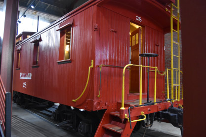 Rutland Railroad caboose 28 built by the railroad in 1928. This caboose was assigned to runs between Rutland, Vermont and Ogdensburg, New York then later downgraded to bunk house use at Bellows Falls. It was donated by the railroad to Nelson Blount in Riverside, Vermont in 1961 and restored by Steamtown in 1995.