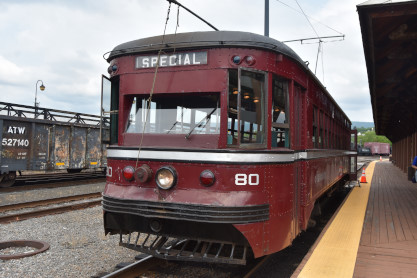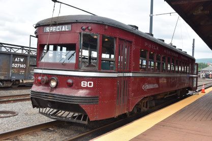 Philadelphia Suburban Transportation Company 80 built by J.G. Brill to Philadelphia and West Chester Traction in 1932. Car 80 was one of ten lightweight "Master Unit" style cars delivered. These cars addressed mounting competition from the automobile by introducing sleek lines, contemporary automotive styling features and cushioned leather seats to the Red Arrow service. Car 80 endured in service until retired and sold in 1982 by the Southeastern Pennsylvania Transportation Authority. It has been returned to its early all-reddish-brown PSTC paint scheme and continues to operate at the Electric City museum.