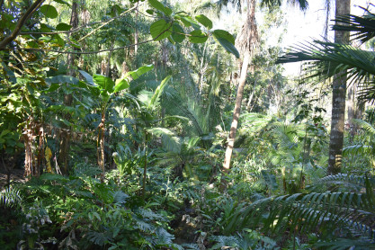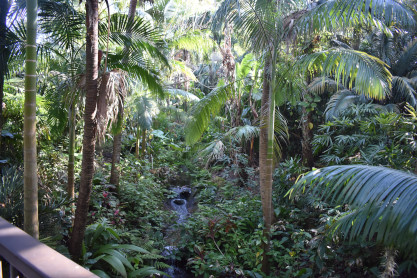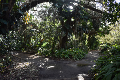 Tropical Stream Garden: This garden creates the atmosphere of a tropical rainforest with a gurgling stream that winds its way through the plantings and into Lake Rowena. Many tropical and subtropical plants suitable for Central Florida are displayed here including aroids, bananas, bird-of-paradise, traveler's tree, bromeliads, calatheas, tropical conifers, crotons, gingers, heliconias, palms, ti plants, ferns, tree ferns, flowering trees, banyan tree, vines and others.