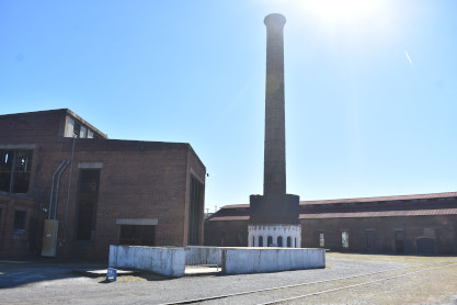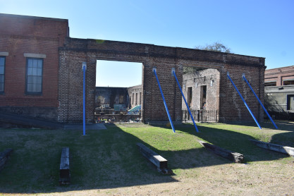 The smokestack was completed in 1855. This 125 foot chimney was used to draw smoke from the blacksmith shop and boiler room via underground tunnels. The lower portion of the stack held a 40,000 gallon iron rainwater collection tank and had small rooms under the tank which served as privies and showers for the shop workers. The wrought iron straps were added in 1902 when the masonry underwent major repairs to fix damage probably caused by lightening strikes. Built of Savannah Grey brick and lime mortar, its height and the wind blowing across its opening at the top drew smoke through the tunnels and up the stack. Southern Railway began selling brick from the the stack soon after the complex closed. The missing brick was restored in the early 1990s.