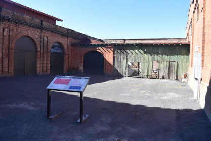 The Blacksmith Shop. Completed in 1855, it housed thirteen forges and steel hammers used the fabricate metal components needed by the railroad to repair, rebuild or build locomotives and other pieces of rolling stock. Smoke from this building went through tunnels to the smokestacks.