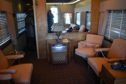 On the turntable again, then the train pulled us back to the switch and reversed back to the station. Elizabeth and I then joined a tour of the Atlantic Wood Industries business Car "Port Wentworth" given by conductor Jan Cottell.