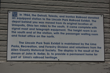 Ohio Southern Railroad later Detroit, Toledo and Ironton Railroad station built in 1893. This station was moved from Uniopolis and is now on display in the park.