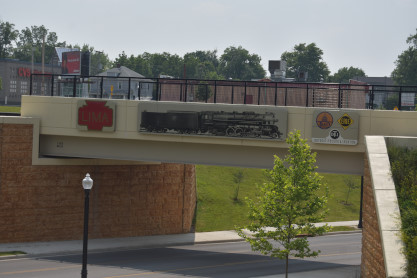 Railroad embles on a road bridge commemorating Lima and the Lima Locomotive Work.
