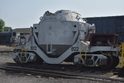 Youngstown Steel Ladle Car, a Kling-type hot metal car, built in Youngstown by the William B. Pollock Company. These cars hauled 75 tons of molten iron, called hot metal, from the blast furnaces to the steelmaking furnaces at steel mills. The cars have a thick refractory brick lining and the ladle is designed to be detachable.