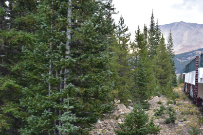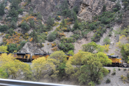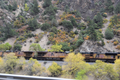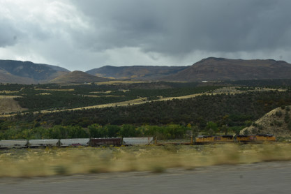 Elizabeth and I arose and did our Internet before we checked out and went to JB's Restuarant for another excellent breakfast. I started the drive driving through the rainshowers from Price, Utah to Mack, where Elizabeth took over driving and she drove through a few rainshowers. West of Rifle, I spotted a train.