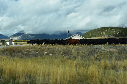 10/2/2023 We arose and after our regular morning preparations, checked out and went to the Mineral in the Delaware Hotel, where we both had French Toast with me having sausage. After that we drove south and got stopped by livestock crossing the highway.
