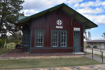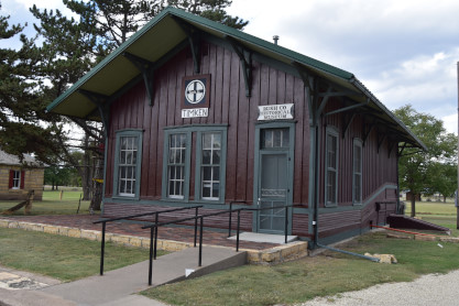 Santa Fe Timken station, buit in 1887, at the Rush County Historical Museum, was constructed prior to the adoption of the 1910 standardized scheme. However, the building resembles the "Number Two" plan. The 24'x42' combination building features a small waiting room adjacent to the telegraph operator's office and ticket counter, and an elevated freight room with loading platform in the rear. Notable features of the building include large six-over-six paned divided light windows in the office and waiting room and a moderately ornate office dormer with projecting gable tower. The building's windows and roof brackets differentiate it from later designs that feature six-over-nine paned windows and simple rafter tails instead of ornate brackets.