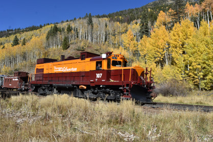 Photo runby five, the diesel helper Durango and Silverton DL-535E 107, nee White Pass and Yukon 107 built by Montreal Locomotive Works in 1969.