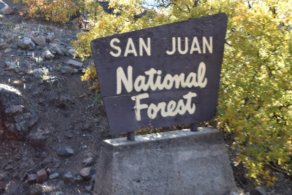The San Juan National Forest signpost. Now we would ride across the Highline.