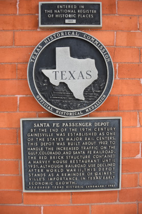 The former Gulf Coast and Santa Fe, later Atchison, Topeka and Santa Fe, Gainesville station built in 1902 which housed a Harvey House Restaurant until 1931. The station saw no passenger rail service from December 5, 1979, when the last Amtrak Lone Star operated, until June 15, 1999, when the first Amtrak Heartland Flyer came through. The Santa Fe Railway deeded the depot to the city on October 19, 1981; however, its restoration was not completed until 2001.