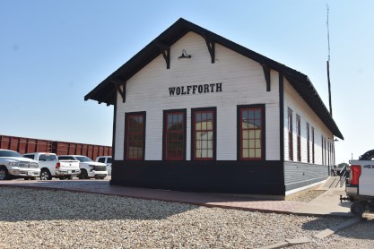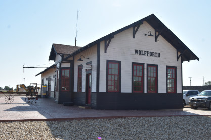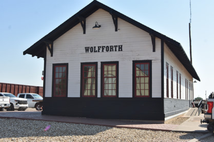 Santa Fe Wolfforth station built in 1925 and used by the Lubbock and Western Railway, which had previously been in Whiteface. The town was established in 1916 and developed as a railroad town when the Panhandle and Santa Fe Railway built through the area.