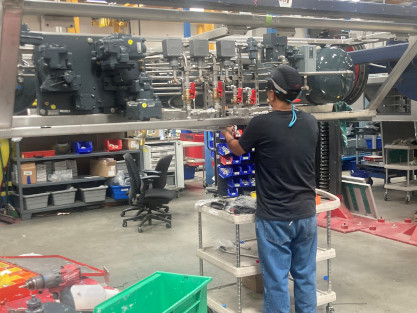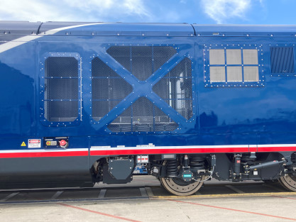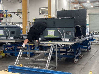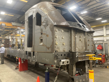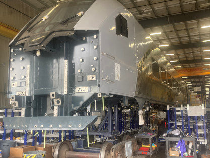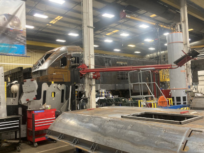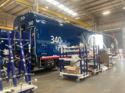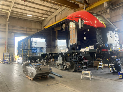 An employee working on a new SCC-44 locomotive for Amtrak.