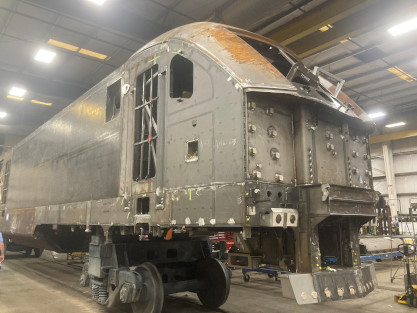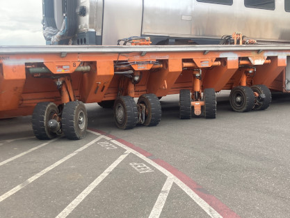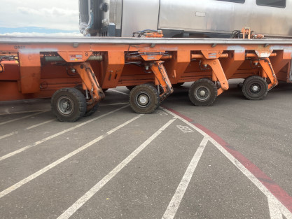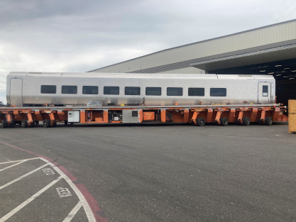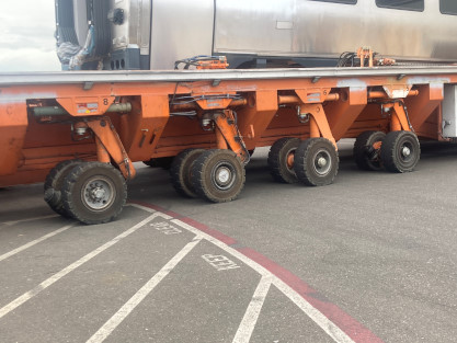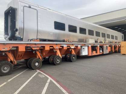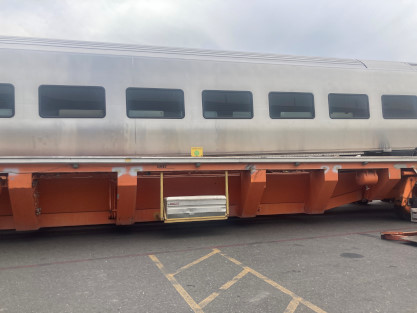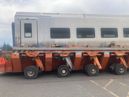 The continuation of the Venture coach being moved into the next shop to be worked on. The wheels of the huge railcar mover turned in different directions to 'steer' it into the building and the whole process was carefully monitored by watchful employees.
