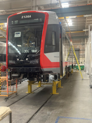 San Francisco Metropolitan Transit Agency streetcar 2126, built by Siemens in 2022 and on a shop stand.