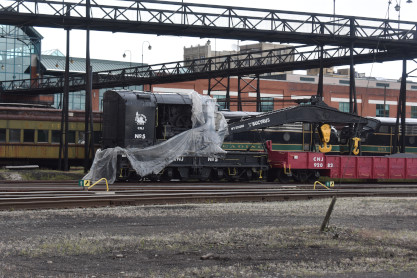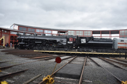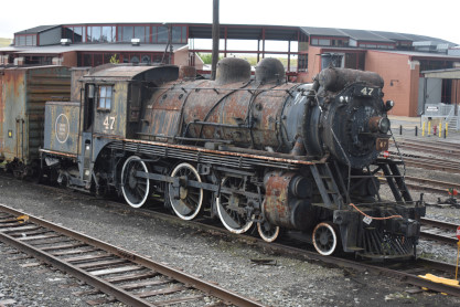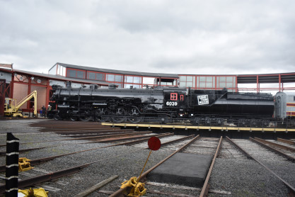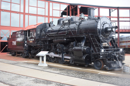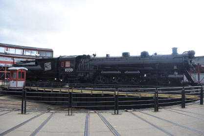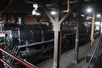 Canadian National 2-8-2 3377 built by Canadian Locomotive Company in 1919. Designed for freight service, 3377 underwent a number of modifications, including being fitted with a superheater, feedwater heater, mechanical stoker and large-capacity air pumps for the braking system, allowing it to haul long main line freight trains. 3377 was sold to F. Nelson Blount by Canadian National in 1961 and moved with the collection to Scranton in 1985.