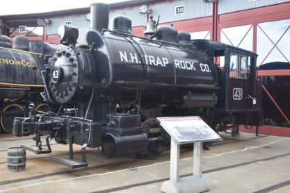 New Haven Trap Rock Company 0-4-0T 43 built by Vulcan Iron Works in 1918 for C. W. Blakeslee & Sons of North Branford, Connecticut, later the New Haven Trap Rock Company. The company had five quarries in Connecticut at its height, quarrying a very hard basalt known as "trap" rock. Because of the regular vertical fracture planes and the tendency to fracture horizontally, the rock breaks into blocks reminiscent of stairs which gave rise to the name "trap", from the German "treppen", meaning "steps". 43 worked for the New Haven Trap Rock Company until 1956, when two GE diesel-electric switchers replaced steam on the run from the North Branford crusher to the Pine Orchard terminal. 43 continued to switch at the crusher and terminal until it was retired in 1959.