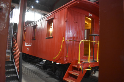 Rutland Railroad caboose 28 built by the railroad in 1928. This caboose was assigned to runs between Rutland, Vermont and Ogdensburg, New York then later downgraded to bunk house use at Bellows Falls. It was donated by the railroad to Nelson Blount in Riverside, Vermont in 1961 and restored by Steamtown in 1995.