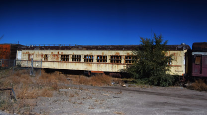 Illinois Central tavern-lounge observation car 3306 built by the railroad in 1947, using components from coach 2175 built in 1916. It was retired in 1968 and sold to L. Saia then re-sold to the Holiday Train operation, running in tour service out of Chihuahua, Mexico. The car was later sold to a private owner in Texas and converted to a cabin, at which time the giant hole was cut in the side. This car was acquired by Iowa Pacific in 2012.