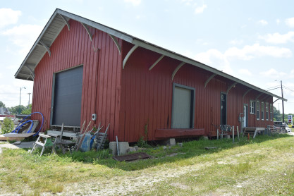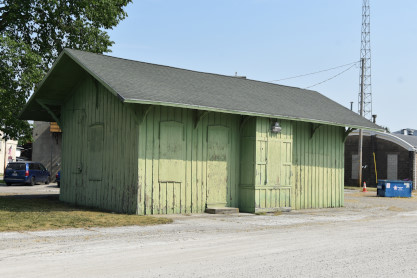 Big Four Wellington freight station which is used as storage. Sometime between 1904 and 1911, this station was moved across the tracks to the northwest side of the tracks from its original location on the southeast side. There was a cheese wharehouse attached to the freight station when it was in its original location.