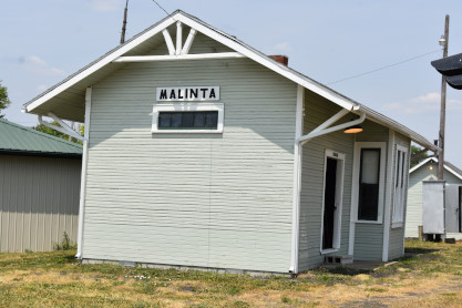 Toledo, St. Louis and Western Malinta station built in 1885. The former Detroit and Lima Northern crossed tthe Toledo, St. Louis and Kansas City at Malinta. This frame standard design Cloverleaf depot served as a junction depot; an interlocking tower was diagonally across the diamond. The depot was moved to Grand Rapids in 1980 to be used as a ticket office for the Bluebird Special of the Toledo Lake Erie and Western Railroad. When difficulties arose and the depot was threatened with demolition, the depot was returned to Malinta.