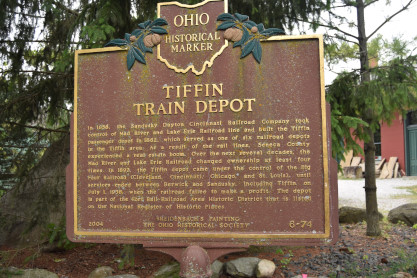 Sandusky, Dayton and Cincinnati Railroad (later Indiana, Bloomington and Western Railway, then Big Four Railroad, then New York Central Railroad) Tiffin station built in 1862 station sits along an old boardwalk area next to an old candy store.
